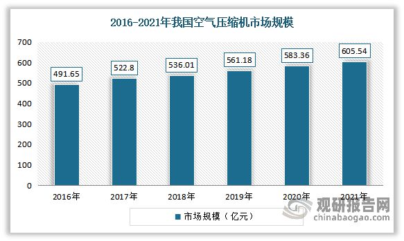 自2012年以來,我國空氣壓縮機行業(yè)市場規(guī)模呈逐年上升態(tài)勢。從國內空氣壓縮機行業(yè)銷售額來看,2020年我國空氣壓縮機市場規(guī)模從2016年的491.65億元增長到了583.36億元。考慮到考慮到國內節(jié)能環(huán)保相關政策日趨嚴格,行業(yè)節(jié)能改造需求將持續(xù)提升。估計2021年我國空氣壓縮機市場規(guī)??梢赃_到605.54億元。