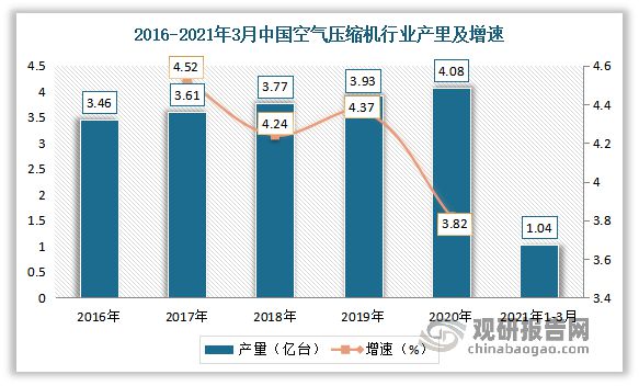 在此背景下,2016年以來,我國空氣壓縮機產(chǎn)量呈現(xiàn)逐年增長態(tài)勢。數(shù)據(jù)顯示,2019年我國空氣壓縮機累計產(chǎn)量為3.93億臺,同比增長4.37%;2020年我國空氣壓縮機累計產(chǎn)量為4.08億臺,同比增長3.82%。2022年1-3月,我國空氣壓縮機累計產(chǎn)量為1.04億臺。
