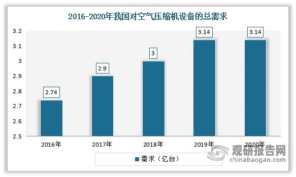 空氣壓縮機是現(xiàn)代工業(yè)的通用設備,廣泛應用于機械制造、冶金、汽車、水泥、電力、電子、紡織等工業(yè)。進入21世紀以來,隨著我國經(jīng)濟進入高速增長期,工業(yè)水平的不斷提升,各行業(yè)商品貿(mào)易的日趨繁榮,對空氣壓縮機設備的總需求也在逐漸提升。2020年我國對空氣壓縮機設備的總需求在3.14億臺左右。