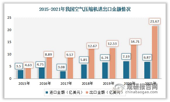 一直以來,我國空氣壓縮機進出口市場保持著貿(mào)易順差。數(shù)據(jù)顯示,2021年我國空氣壓縮機行業(yè)進出口總額為28.46億美元,其中出口額為21.67億美元,額為6.87億美元,實現(xiàn)貿(mào)易順差14.73億美元。
